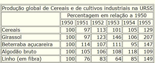 Cabe assinalar que, se nos primeiros três ou quatro anos do quinto Plano Quinquenal apenas tivemos um incremento da produção de cereais e cultivos industriais, em 1955, graças à aplicação das diversas medidas que conhecemos, a colheita global dos cultivos subiu consideravelmente. Em comparação com 1954, as colheitas totais aumentaram, em 1955, nas seguintes proporções: cereais — 22%; girassol — 95%; beterraba açucareira — 54%; fibra de linho — 74%. Não aumentou o rendimento do algodão, mas isto foi devido aos danos causados aos brotos pelas geadas. Em várias zonas, particularmente nas terras não negras, foram baixas as colheitas de batatas.