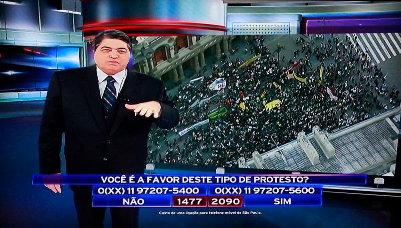 Mas os canais n-1 não se reduzem ao Facebook. Pelo Twitter, um efeito curioso ocorria no começo da manifestação. Vários perfis acompanhavam, ao vivo, a cobertura da velha mídia televisiva. E os perfis compartilhavam links das transmissões televisivas embedadas nos portais, como o da GloboNews e o da BandNews. Ontem, as emissoras de TV, sem saber, erraram. Com a cabeça no século XX, os diretores e editores da TV faziam uma emissão para audiência televisiva, enquanto que o “embed” do player nos portais ajudava os chamados “ativistas de sofá” a narrarem, em estado bruto, a ação grotesca da Polícia Militar na Rua da Consolação. As caras imagens aéreas ficavam na mão dos “confirmados na rede, mas não presentes nas ruas”. O hacking, feito pela própria estrutura de mídia que criminalizava a passeata (vândalos, baderna, “gente agressiva”, difamadores), se tornou fundamental para o combate aos “racionários do sofá” – que são perfis pagos pelo poder para ficar desqualificando os protestos ns ruas através da internet. A televisão, naquele momento, sendo vista por adolescentes e idosos (o horário das 18h às 19h é deles) e a internet sendo ocupada pelos ‘confirmados e presentes na rua” e pelos “confirmados e presentes na rede”.