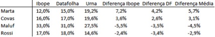 Evidentemente, todos sabem que pesquisa não tem fidelidade absoluta e enfrenta limites geográficos, de classe social ou metodológicos. Mas, evitam erros muito perceptíveis para não comprometer seu bem mais valioso que é a credibilidade. Não dá para falar em erro metodológico, pois isso afetaria da mesma forma outras localidades e não apenas São Paulo, a cidade onde está grande parte do mercado financeiro, do setor produtivo, da mídia nacional e dos setores médios da sociedade.