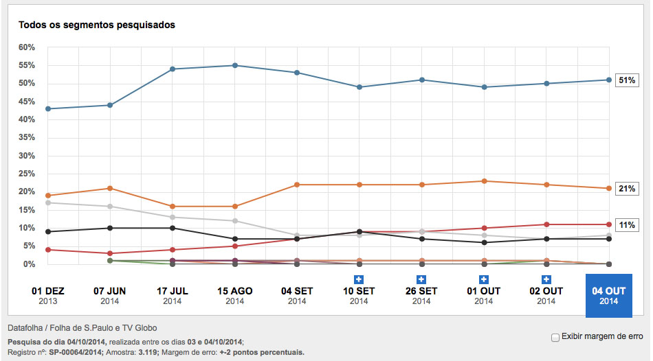 Os números abaixo de 5% foram mantidos pelos institutos até agosto, quando a eleição já tinha plena cobertura de mídia e começava nas ruas. O petista arrastou nos 10% das intenções de voto até o dia 1o. de outubro, chegando ao máximo de 11% no dia 4, véspera da eleição. A boca de urna do Ibope já surpreendeu ao mostrar Padilha com 20%, índice na margem de erro para que o petista disputasse um eventual segundo turno com Alckmin (52%) e Skaf com (22%).