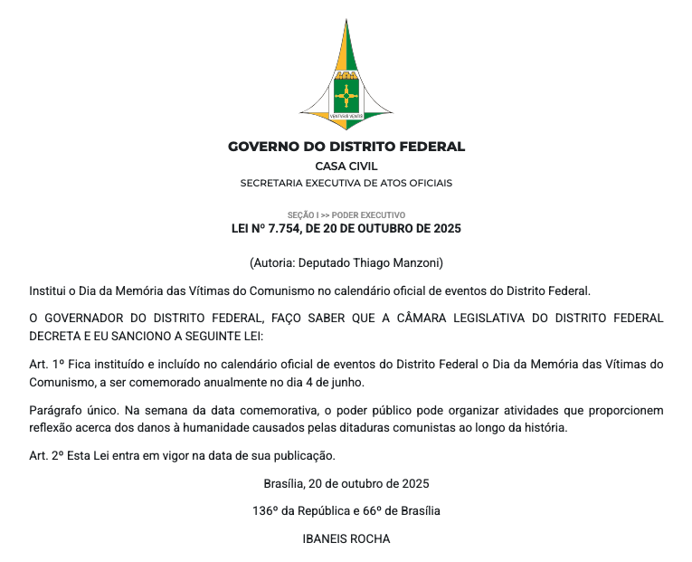 Antes da decretação da Semana Anti-Comunismo por Donald Trump, o governador do Distrito Federal, Ibaneis Rocha (MDB), sancionou a Lei 7.754/2025, de autoria do deputado Thiago Manzoni (PL), que institui no calendário de eventos do DF o Dia da Memória das Vítimas do Comunismo em 4 de junho. A medida foi publicada no Diário Oficial do Distrito Federal no dia 21 de outubro.