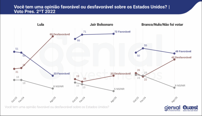 - Estados Unidos: entre eleitores de Lula, a avaliação desfavorável passou de 31% em 2023 para 69% em 2025. Já entre os eleitores de Bolsonaro, a aprovação se manteve alta, oscilando entre 66% e 72%. Entre quem votou branco, nulo ou não compareceu, a opinião favorável caiu de 55% para 49%. Fonte: Genial/Quaest.