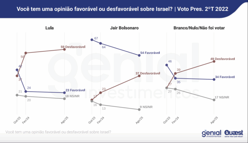 A opinião favorável da população brasileira em relação a Israel apresentou uma queda ainda maior: despencou de 52% em outubro de 2023 para 35% em agosto de 2025. No mesmo período, a opinião desfavorável subiu de 27% para 50%. O recorte temporal da pesquisa contempla o período do massacre do governo de Benjamin Netanyahu contra a população palestina na Faixa de Gaza, iniciado em 7 de outubro de 2023.