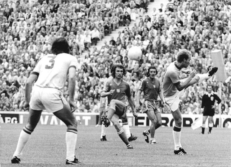 Ademir da Guia (à direita) durante o jogo entre Brasil e Polônia pela disputa do terceiro lugar na Copa do Mundo de 1974, em Munique. À esquerda, Marinho (Brasil), Adam Musial e Henryk Kasperczak (Polônia). Crédito: Bundesarchiv, Bild 183-N0716-0306 / Foto: Rainer Mittelstädt / CC BY-SA 3.0 DE