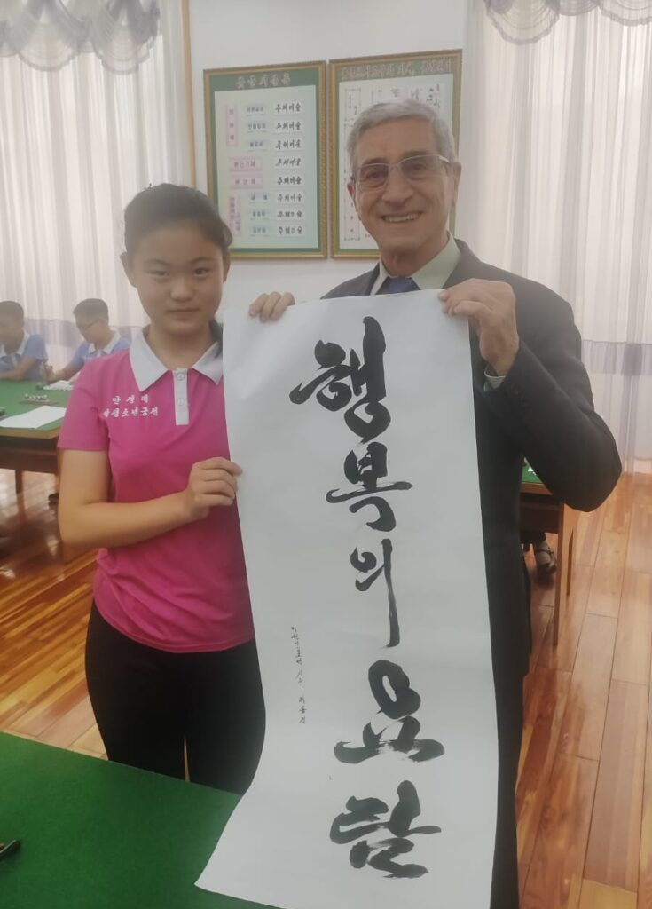 Walter Sorrentino, presidente da Fundação Maurício Grabois, ao lado de uma aluna do Palácio de Alunos e Crianças Mangyongdae, em Pyongyang (Coreia Popular). Durante a aula de arte da escrita, a estudante escreveu a mensagem “Homenagem ao Partido”. Visita ocorreu durante as celebrações dos 80 anos do Partido do Trabalho da Coreia. 09/10/2025. Crédito: Arquivo pessoal / Reprodução