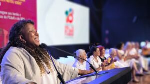 A ministra dos Direitos Humanos e Cidadania, Macaé Evaristo durante homenagem aos mortos e desaparecidos no 16º Congresso do PCdoB. Foto: Joanne Mota