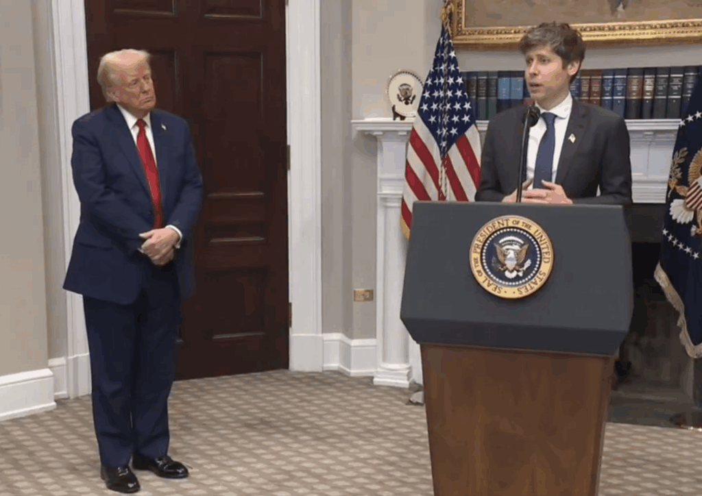 O presidente dos EUA, Donald Trump, e o CEO da OpenAI, Sam Altman, durante o anúncio do projeto Stargate — parceria entre SoftBank, OpenAI e Oracle, com investimento estimado em US$ 500 bilhões para construção de centros de dados de IA nos Estados Unidos. Casa Branca, 21/01/2025. Crédito: Reprodução / The White House