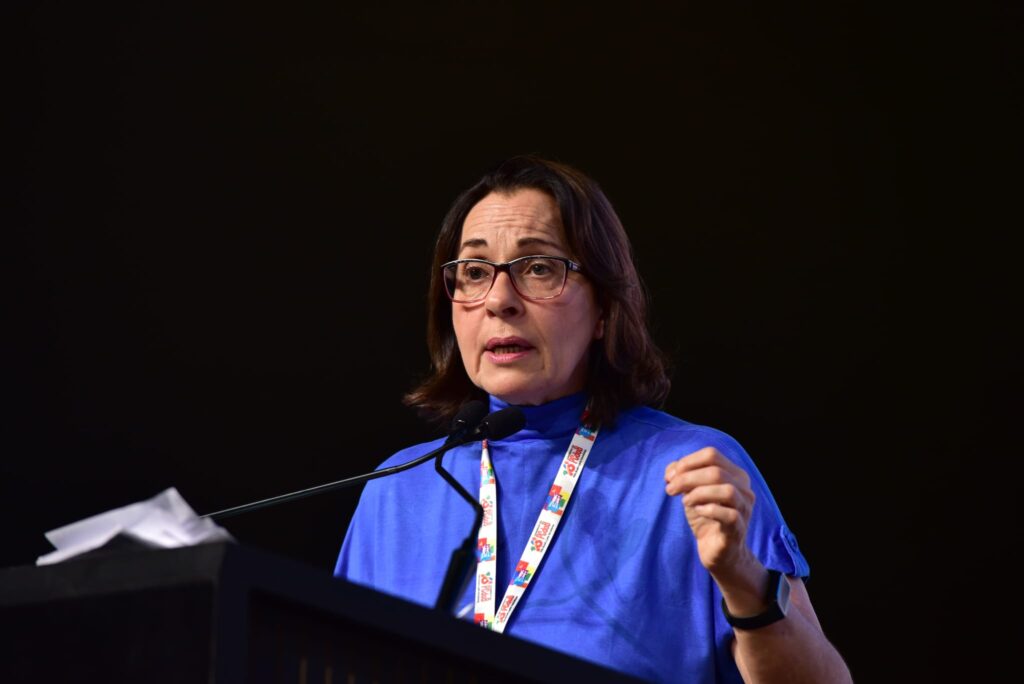 Nádia Campeão faz intervenção no 16º Congresso do PCdoB, em Brasília, em 18/10/2025. À época, exercia a função de secretária de Organização do Partido. Na plenária final do Congresso, foi eleita vice-presidenta do PCdoB. Foto: Murilo Nascimento