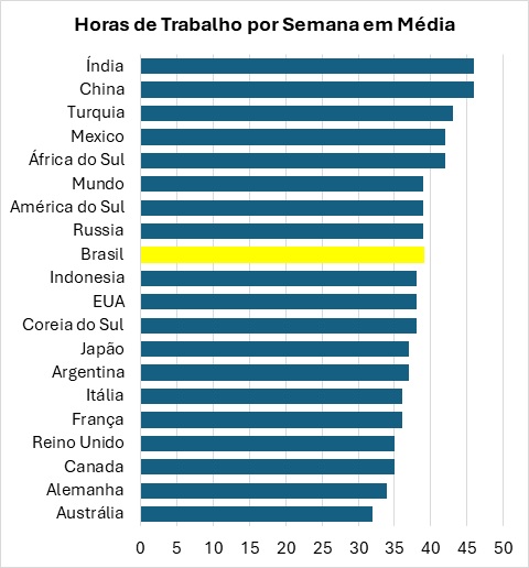 O terceiro argumento é que a jornada média de trabalho no Brasil já é de 39 horas. A CLT define jornadas semanais máximas ainda menores para algumas categorias, por exemplo: 30 horas para os jornalistas e 20 horas para os médicos. Segundo dados da Organização Internacional do Trabalho (OIT), a jornada de trabalho média entre todos os países do mundo e da América do Sul é 39 horas como no Brasil. Nas vinte maiores economias do mundo, a jornada média é de 38 horas (ver Gráfico 2), enquanto nos países membros da OCDE é de 36,8 horas.