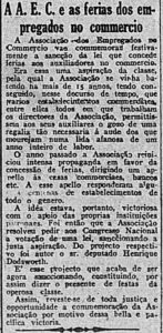 Em uma modesta nota publicada no jornal Correio da Manhã, de 29 de dezembro de 1925, a Associação dos Empregados no Commercio (AAEC) do Rio de Janeiro vinha a público comemorar a sanção da primeira lei de férias aprovada no Brasil. A nota da AAEC foi publicada cinco dias após o presidente da República Arthur Bernardes sancionar o Decreto nº 4.982, de 24 de dezmbro de 1925, concedendo 15 dias de férias remuneradas anuais aos empregados e operários de estabelecimentos comerciais, industriais e bancários, jornalistas, e de instituições de caridade e beneficentes. O decreto ainda estabelecia que o período de descanso pudesse ser concedido de uma só vez ou parcelado e previa multa de dois milhões de réis a quem infringisse a nova legislação. O valor era relativamente alto. A nível de comparação, na mesma edição do Correio da Manhã, uma casa com duas salas, dois quartos, cozinha, banheiro e chuveiro era anunciada por dezesseis milhões de réis.