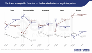 Os movimentos geopolíticos dos últimos anos refletiram na opinião da população brasileira. Entre 2023 e 2025, a aprovação da China subiu de 34% para 49%, enquanto EUA e Israel perderam apoio, revelou pesquisa Quaest divulgada em agosto. O salto maior ocorreu de 2024 para 2025, quando a opinião favorável saltou 11 pontos percentuais. Por outro lado, a opinião desfavorável em relação à potência asiática caiu de 44% para 37%.