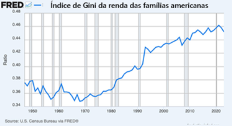 Evolução do índice de Gini da renda das famílias nos Estados Unidos mostra tendência de aumento da desigualdade desde os anos 1980, atingindo nos anos recentes os níveis mais elevados da série histórica. Fonte: Dados do U.S. Census Bureau, compilados pelo Federal Reserve Economic Data (FRED). Crédito: Imagem reproduzida de artigo do NECAT/Universidade Federal de Santa Catarina.