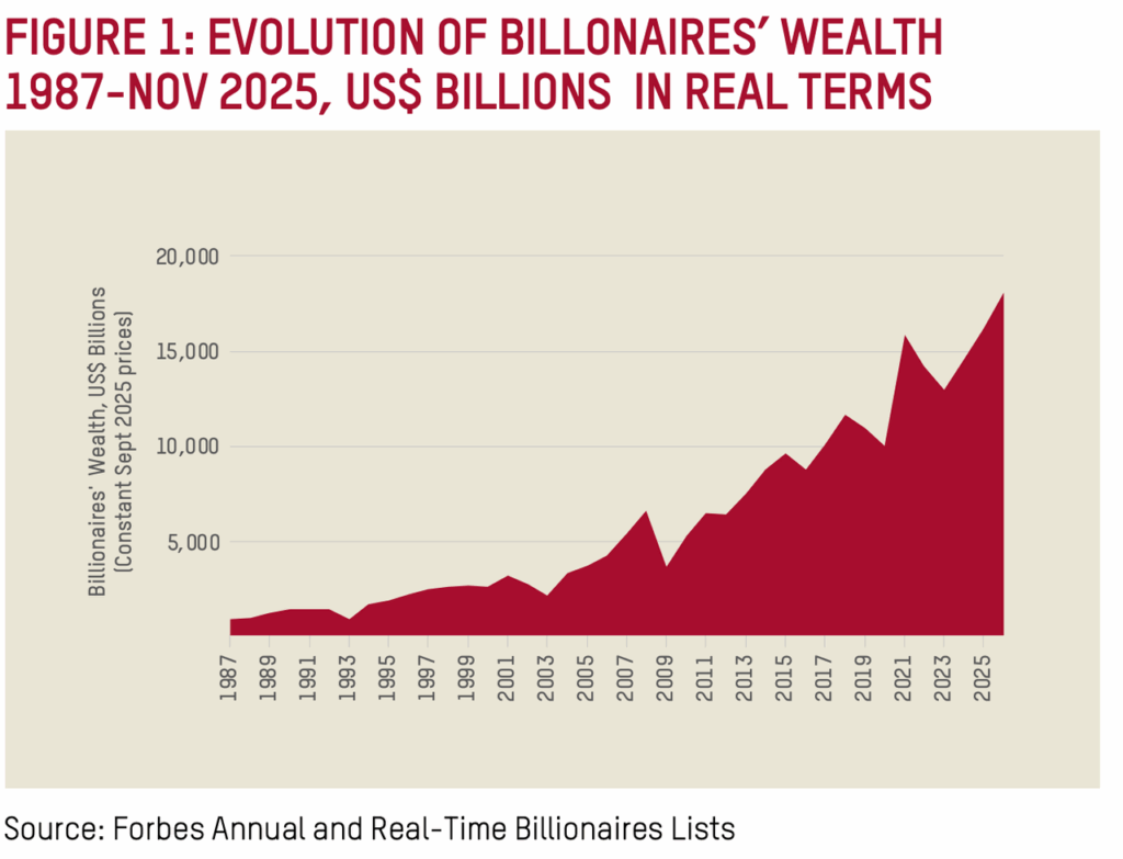 Série histórica apresenta a evolução da riqueza agregada dos bilionários entre 1987 e novembro de 2025, em dólares constantes. Créditos: Dados da revista Forbes. Imagem reproduzida de artigo do World Socialist Web Site.