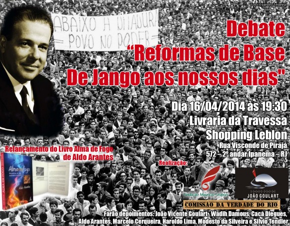Cezar Xavier7 de abril de 2014O evento ainda contará com o relançamento do livro de memórias “Alma em Fogo – Memórias de um Militante Político”, de Aldo Arantes, que foi presidente da UNE durante a campanha da legalidade para a posse de Jango. Participam do debate João Vicente Goulart, Wadih Damous, Cacá Diegues, Marcelo Cerqueira, Haroldo Lima, Modesto da Silveira […]